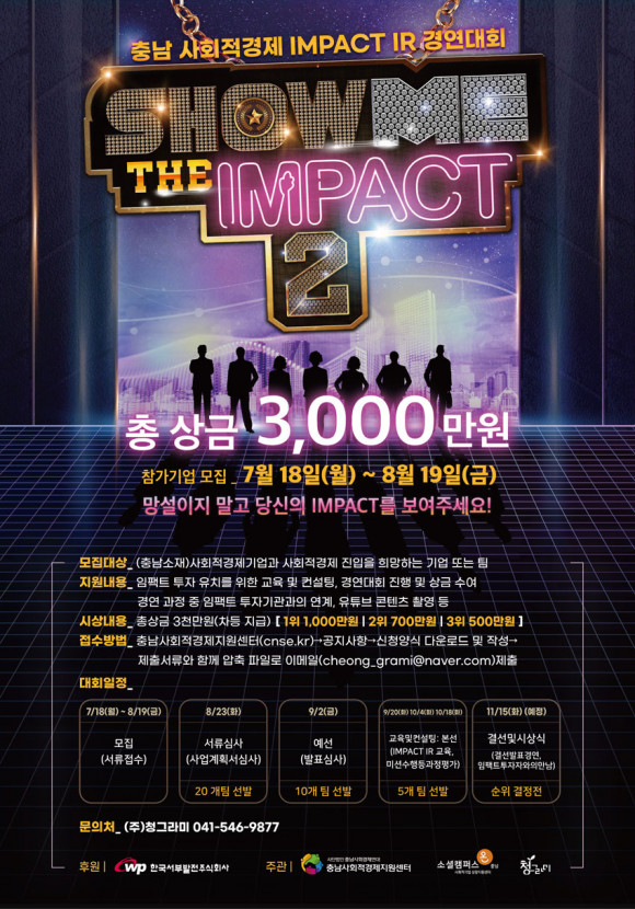 ¡®SHOW ME THE IMPACT2¡¯ Ãæ³² »çȸÀû°æÁ¦ ÀÓÆÑÆ® IR °æ¿¬´ëȸ¿¡ Âü°¡ÇÑ ÆÀµéÀº ½Å±Ô »ç¾÷ ¾ÆÀÌÅÛÀÇ »çȸÀû°¡Ä¡¿Í Áö¼Ó°¡´É¼ºÀ» °æ¿¬ Áß Æò°¡ ¹Þ¾Æ, ¡âÃÑ»ó±Ý 3õ¸¸ ¿øÀ»(1À§ 1õ¸¸ ¿ø, 2À§ 700¸¸ ¿ø, 3À§ 500¸¸ ¿ø µî) °É°í °æ¿¬À» ÆîÄ¡°Ô µÈ´Ù.