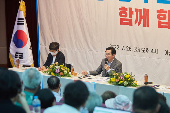 ÀÌ¾î ±Ù·ÎÀÚÁ¾ÇÕº¹Áö°ü¿¡¼ ¿¸° ¿Â¾ç2µ¿ °£´ãȸ¿¡ Âü¼®ÇÑ ¹Ú ½ÃÀåÀº ¡°½Ã¹ÎµéÀÇ ¸ñ¼Ò¸®¸¦ ¹Î¼±8±â ºñÀü°ú ¸ñÇ¥¿¡ ´ã±â À§ÇØ ÃÖ¼±À» ´ÙÇß´Ù. ½Ã¹Îµé°ú ÇÔ²² ±×¸®°í ÀÖ´Â »õ·Î¿î ¾Æ»êÀÇ ¹ßÀüÀ» À§ÇØ ¸¹Àº °Ý·Á¿Í Áöµµ¸¦ ¹Ù¶õ´Ù¡±¶ó¸ç ¡°½Ã¹Î ¸ðµÎ¸¦ ÇູÇÏ°Ô ÇÒ ¼ö ÀÖµµ·Ï 2600¿© ¸íÀÇ °øÁ÷ÀÚ¿Í ÇÔ²² ÃÖ¼±À» ´ÙÇϰڴ١±°í ¸»ÇØ ½Ã¹Îµé·ÎºÎÅÍ ¿·ÄÇÑ ¹Ú¼ö°¥Ã¤¸¦ ¹Þ¾Ò´Ù.