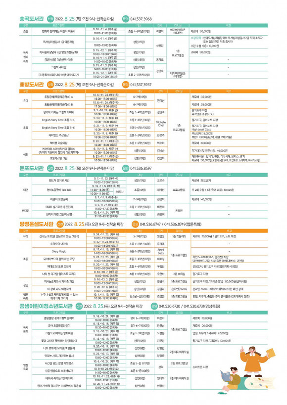 ÇϹݱâ ÇÁ·Î±×·¥Àº ´ë¸é ¼ö¾÷ 51°³, ¿Â¶óÀÎ ºñ´ë¸é ¼ö¾÷ 5°³·Î ¿î¿µµÇ¸ç ¡ã¿¬·Éº° µ¶¼ ±â¹Ý ÇÁ·Î±×·¥ ¡ãÀü¹®ÀÚ°ÝÃëµæ°úÁ¤ ¡ãµµ¼°üº° ƯÈÇÁ·Î±×·¥(Áß¾Óµµ¼°ü: ¿µ¾î, ¼Û°î: µ¶¼½É¸®, ÅÁÁ¤¿Â»ù: À¥Å÷, ²Þ»ù: ¿µ»ó) µî ´Ù¾çÇÑ ÁÖÁ¦·Î ±¸¼ºµÅ ÀÖ´Ù.