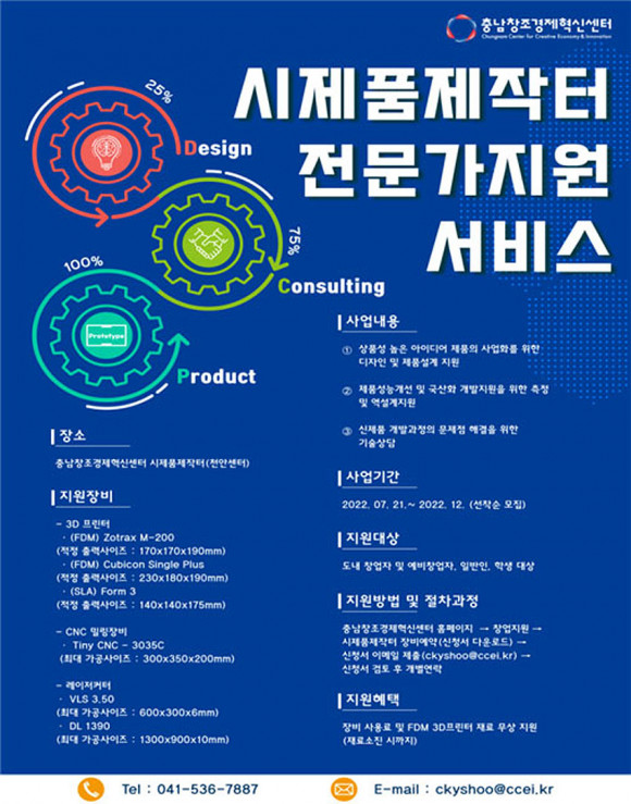 Ãæ³²Ã¢Á¶°æÁ¦Çõ½Å¼¾ÅÍ(ÀÌÇÏ Ãæ³²¼¾ÅÍ)´Â ¿ÃÇØ 12¿ù±îÁö Áö¿ª (¿¹ºñ)â¾÷ÀÚ ¹× ÀϹÝÀÎ, ¸ÞÀÌÄ¿ µîÀ» ´ë»óÀ¸·Î ½ÃÁ¦Ç°Á¦ÀÛÅÍ Àü¹®°¡ Áö¿ø ¼ºñ½º¸¦ ¿î¿µÇÑ´Ù.