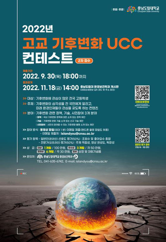 Ãæ³²µµ¸³´ëÇб³(ÃÑÀå ±è¿ëÂù)´Â ¡®2022³â °í±³ ±âÈĺ¯È UCC ÄÜÅ×½ºÆ®¡¯ 2Â÷ Á¢¼ö¸¦ 9¿ù 30ÀϱîÁö ½ÃÇàÇÑ´Ù°í ¹àÇû´Ù.