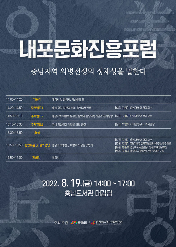 Ãæ³²¿ª»ç¹®È¿¬±¸¿ø Á¶ÇÑÇÊ ¿øÀåÀº ¡°Ãæ³²Àº ÀǺ´ÀüÀïÀ» ½ÃÀÛÀ¸·Î ¾Ö±¹°è¸ù¿îµ¿, 3.1¿îµ¿ ±×¸®°í ÀÏÁ¦°Á¡±â ´Ù¾çÇÑ ¹æ½ÄÀÇ µ¶¸³¿îµ¿ÀÌ Àü°³µÈ Áö¿ª¡±À̶ó¸ç ¡°À̹ø Æ÷·³À» ÅëÇØ Ãæ³²ÀÇ µ¶¸³¿îµ¿°ú µ¶¸³Á¤½ÅÀÇ °¡Ä¡¸¦ ³Î¸® ¾Ë¸± ¼ö ÀÖ´Â °è±â°¡ µÇ±æ ¹Ù¶õ´Ù¡±°í °Á¶Çß´Ù.