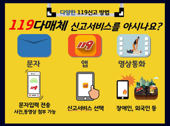 ¹®ÀÚ ½Å°í´Â 119¹øÈ£·Î ¹®ÀÚ¸¦ ÀÔ·ÂÇØ Àü¼ÛÇϸé 119»óȲ½Ç·Î ½Å°í ³»¿ëÀÌ Á¢¼öµÇ¸ç »çÁø°ú µ¿¿µ»ó ÷ºÎµµ °¡´ÉÇÏ´Ù.