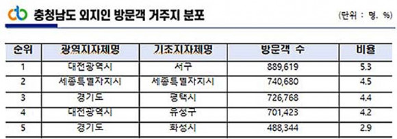 Ãæ³²µµ¸¦ ¹æ¹®ÇÑ °ü±¤°´ÀÇ °ÅÁÖÁö´Â °æ±âµµ°¡ 32.1%·Î °¡Àå ¸¹¾Ò°í, ¼¿ïƯº°½Ã(15.5%), ´ëÀü±¤¿ª½Ã(15.7%) ¼øÀ¸·Î ³ªÅ¸³µ´Ù.