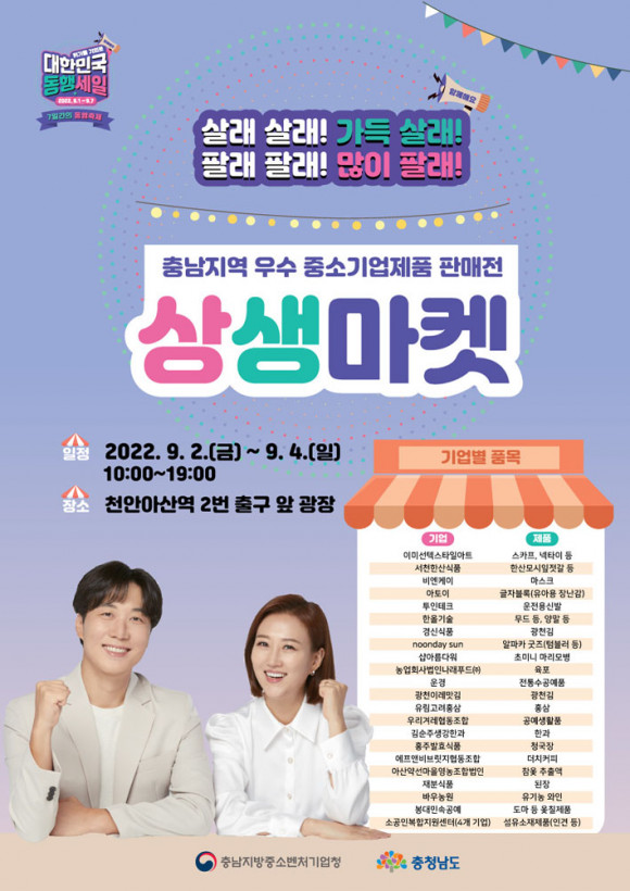 µµ´Â À̹ø µ¿ÇàÃàÁ¦ ±â°£ Áß 2ÀÏ¡4ÀÏ 3Àϰ£ õ¾È¾Æ»ê¿ª 2¹ø Ãⱸ ¾Õ ±¤Àå¿¡¼ Ưº° ÆÇ¸ÅÀü ¡®Ãæ³²Áö¿ª ¿ì¼ö Áß¼Ò±â¾÷ Á¦Ç° »ó»ý¸¶ÄÏ¡¯À» ¿î¿µÇÑ´Ù.