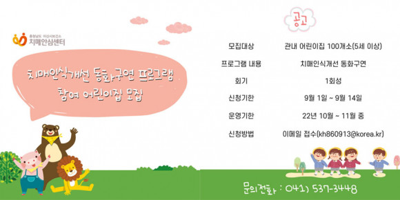 ¸ðÁý ´ë»óÀº °ü³» ¾î¸°ÀÌÁý 100°³¼ÒÀ̸ç, ½ÅûÀº ¾Æ»ê½Ã Ä¡¸Å¾È½É¼¾ÅÍ(041-537-3448)·Î ¹®ÀÇÇÏ¸é µÈ´Ù.