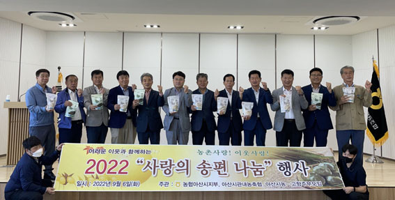 À̳¯ Çà»ç¿¡´Â ³óÇù ¾Æ»ê½ÃÁöºÎÀå, Áö¿ª ³ó¡¤ÃàÇù Á¶ÇÕÀå ¹× ³ó°¡ÁֺθðÀÓ°ú °íÇâÁֺθðÀÓ È¸¿ø 30¿© ¸íÀÌ Âü¿©ÇØ Á¤¼º½º·´°Ô ÁغñÇÑ ¼ÛÆí 676¹Ú½º(1,800¸¸¿ø »ó´ç)¸¦ Áö¿ª µ¶°Å³ëÀÎ, ´Ù¹®È°¡Á¤, ¼Ò³â¼Ò³à°¡Àå, »õÅ͹Πµî¿¡°Ô Àü´ÞÇß´Ù.