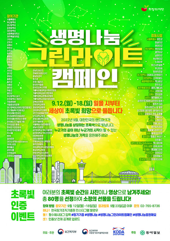 ¿ÃÇØ·Î 3ȸ¸¦ ¸Â´Â ±×¸°¶óÀÌÆ® Ä·ÆäÀÎÀº »ý¸í³ª´® ¹®È È®»êÀ» À§ÇØ °ø°ø±â°ü, º´¿ø µî 81°³ ±â°üÀ¸·Î È®´ëµÆÀ¸¸ç »ý¸í³ª´® ½½·Î°Ç ¡®»ý¸íÀ» ÀÕ´Â ´Ù¸®¡¯ÀÇ Àǹ̸¦ »ì·Á ´ë±³ ¹× ·£µå¸¶Å©¿¡ Àå±â±âÁõÀ» »ó¡ÇÏ´Â ÃÊ·Ï»ö ºûÀ» Á¡µîÇÏ¿© »ý¸í³ª´®ÀÇ ¸Þ½ÃÁö¸¦ Àü´ÞÇÑ´Ù.