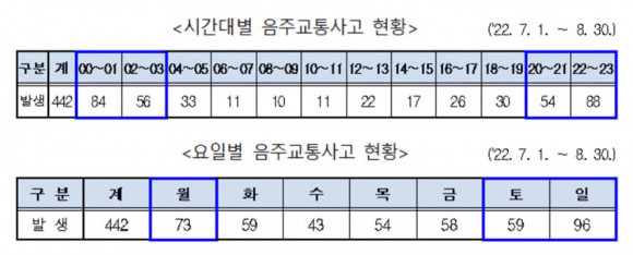 À½ÁÖ»ç°í°¡ ´Ù¼ö ¹ß»ýÇÑ ½Ã°£´ë´Â 20½Ã~23½Ã 142°Ç, 24½Ã~03½Ã 140°ÇÀ¸·Î Àüü À½ÁÖ»ç°íÀÇ 63.8%¸¦ Â÷ÁöÇϰí, ¿äÀϷδ Åä¿äÀÏ¿¡¼ ¿ù¿äÀÏ »çÀÌ¿¡ 228°ÇÀ¸·Î Àüü À½ÁÖ»ç°íÀÇ 51.6%¸¦ Â÷ÁöÇÏ¿´´Ù.