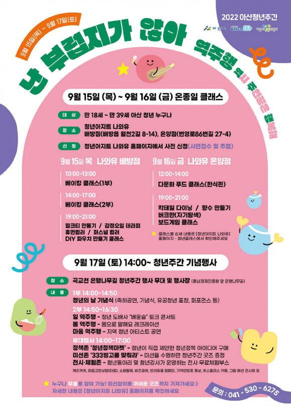 15ÀÏ¿¡´Â û³â¾ÆÁöÆ® ³ª¿ÍÀ¯(¹è¹æÁ¡)¿¡¼ º£ÀÌÅ·, °¨Á¤¿ÀÀÏ, ÆÛ½º³ÎÄ÷¯, ÈÞ¸ÕÄ÷¯, DIY ÆÄ¿ìÄ¡ ¸¸µé±â µîÀÇ Å¬·¡½º¸¦ ÁøÇàÇϸç, 16ÀÏ¿¡´Â û³â¾ÆÁöÆ® ³ª¿ÍÀ¯(¿Â¾çÁ¡)¿¡¼ ´Ù¹®È Ǫµå, ĬÅ×ÀÏ, Çâ¼ö, º¸µå°ÔÀÓ µîÀÇ Å¬·¡½º°¡ ÁøÇàµÈ´Ù.