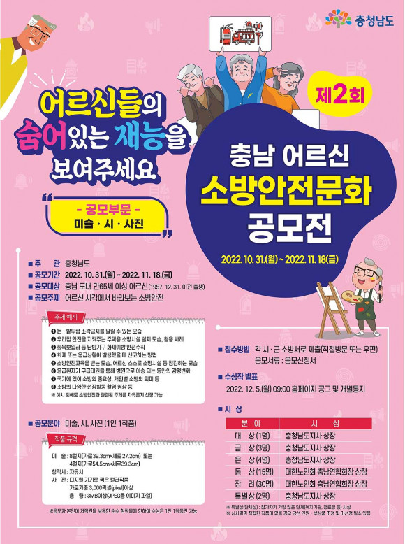 À̹ø °ø¸ðÀüÀº Ãæ³²¿¡ °ÅÁÖ ÁßÀÎ ¸¸ 65¼¼(1957³â ÀÌÀü Ãâ»ý)ÀÌ»óÀÇ ¾î¸£½ÅµéÀ» ´ë»óÀ¸·Î ÇÏ¸ç °ø¸ð ºÐ¾ß´Â ¾î¸£½ÅÀÌ ¹Ù¶óº¸´Â ¼Ò¹æ¾ÈÀü¿¡ °üÇÑ ¹Ì¼ú, âÀÛ½Ã, »çÁø 3°³ ºÐ¾ß·Î ÁøÇàµÇ¸ç 1Àδç 1ÀÛǰ °ø¸ð°¡ °¡´ÉÇÏ´Ù.