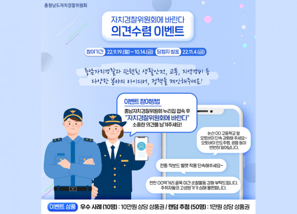 µµ¹Î ¸ñ¼Ò¸®¸¦ µè°í, Á¤Ã¥¿¡ ¹Ý¿µÇϱâ À§ÇØ ¸¶·ÃÇÑ À̹ø À̺¥Æ®´Â µµ ÀÚÄ¡°æÂûÀ§¿øÈ¸ ȨÆäÀÌÁö(https://www.chungnam.go.kr/cnapc/intro/cnapcSelfPolice.do)¸¦ ÅëÇØ ´©±¸³ª Âü¿©ÇÒ ¼ö ÀÖ´Ù.