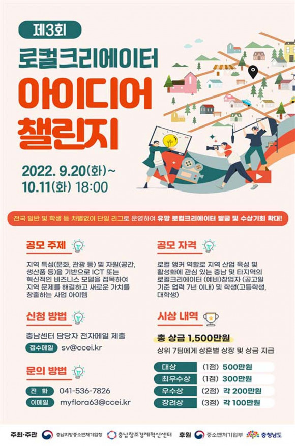 Ãæ³²Ã¢Á¶°æÁ¦Çõ½Å¼¾ÅÍ´Â Ãæ³²Áö¹æÁß¼Òº¥Ã³±â¾÷ûÀÌ ÁÖÃÖÇϰí ÃæÃ»³²µµ¿Í Áß¼Òº¥Ã³±â¾÷ºÎ°¡ ÈÄ¿øÇÏ´Â ¡®Á¦3ȸ ·ÎÄÃÅ©¸®¿¡ÀÌÅÍ ¾ÆÀ̵ð¾î縰Áö¡¯´ëȸ°¡ 9¿ù 5ÀϺÎÅÍ Âü°¡ÀÚ¸¦ °ø°³¸ðÁý ÇÑ´Ù°í ¹àÇû´Ù.