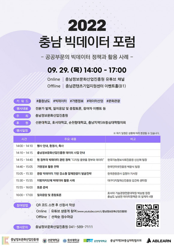 ¶ÇÇÑ À̹ø Æ÷·³¿¡¼´Â ÁøÈï¿ø°ú Çù·ÂÇϰí ÀÖ´Â Ãæ³²Áö¿ªSWÁ߽ɴëÇÐÇùÀÇȸ(¼±¹®´ë, È£¼´ë, ¼øÃµÇâ´ë)¿Í SWÀü¹®Àη¾缺±â°ü(¿¡ÀÌºí·±)ÀÌ ÇÔ²² °³ÃÖÇÏ¿© ÇâÈÄ Á¤Ã¥ º¯È¿¡ µû¸¥ Ãæ³²ÀÇ µ¥ÀÌÅÍ Àü¹®Àη ¾ç¼º ¹æÇâµµ ¸ð»öÇÑ´Ù.