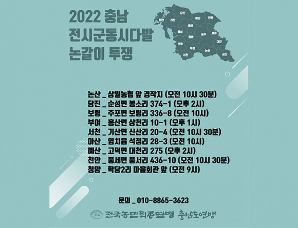 9¿ù 21ÀÏ ½Ç½ÃµÇ´Â Ãæ³²µµ³» µ¿½Ã´Ù¹ß ³í°¥ÀÌÅõÀïÀº ¡ã³í»ê »ó¿ù³óÇù ¾Õ °æÀÛÁö(¿ÀÀü 10½Ã 30ºÐ) ¡ã´çÁø ¼ø¼º¸é ºÀ¼Ò¸® 374-1(¿ÀÈÄ 2½Ã) ¡ãº¸·É ÁÖÆ÷¸é º¸·É¸® 336-8(¿ÀÀü 10½Ã) ¡ãºÎ¿© È«»ê¸é »óõ¸® 10-1(¿ÀÈÄ 1½Ã) ¡ã¼Ãµ ±â»ê¸é ½Å»ê¸® 20-4(¿ÀÀü 10½Ã 30ºÐ) ¡ã¾Æ»ê ¿°Ä¡À¾ ¼®Á¤¸® 28-3(¿ÀÀü 10½Ã) ¡ã¿¹»ê °í´ö¸é ´ëõ¸® 275(¿ÀÈÄ 2½Ã) ¡ãõ¾È dz¼¼¸édz¼¸® 436-10 (¿ÀÀü 10½Ã 30ºÐ) ¡ãû¾ç Çдç2¸® ¸¶À»È¸°ü ¾Õ(¿ÀÀü 9½Ã)¿¡¼ ½Ç½ÃµÈ´Ù.