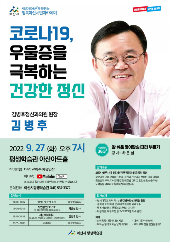 ¾Æ»ê½Ã(½ÃÀå ¹Ú°æ±Í)°¡ ¿À´Â 9¿ù 27ÀÏ ¿ÀÈÄ 7½Ã Á¤½Å°úÀü¹®ÀÇ ±èº´ÈÄ ¿øÀåÀ» ÃÊÃ»ÇØ ¾Æ»ê½ÃÆò»ýÇнÀ°ü ¾Æ»ê¾ÆÆ®È¦(±¸ °ø¿¬Àå)¿¡¼ ¡®Äڷγª19, ¿ì¿ïÁõÀ» ±Øº¹ÇÏ´Â °Ç°ÇÑ Á¤½Å¡¯À̶ó´Â ÁÖÁ¦·Î Çູ¾Æ»ê ½Ã¹Î¾ÆÄ«µ¥¹Ì Ư°À» °³ÃÖÇÑ´Ù.