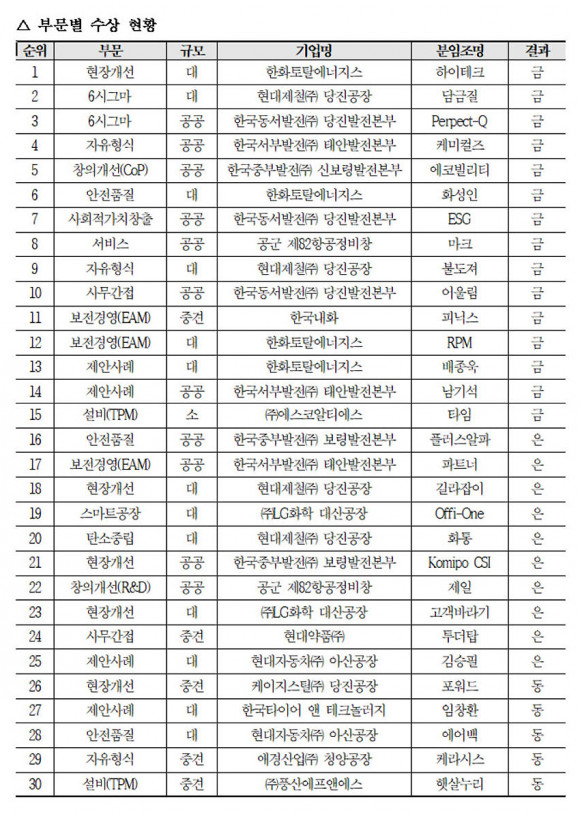 ´ëȸ °á°ú, µµ³»¿¡¼´Â ÇÏÀÌÅ×Å©(ÇÑÈÅäÅ»¿¡³ÊÁö½º) µî 15°³ ºÐÀÓÁ¶°¡ ±Ý»óÀ», Ç÷¯½º¾ËÆÄ(Çѱ¹ÁߺιßÀü º¸·É¹ßÀüº»ºÎ) µî 10°³ ºÐÀÓÁ¶°¡ Àº»óÀ», Æ÷¿öµå(ÄÉÀÌÁö½ºÅ» ´çÁø°øÀå) µî 5°³ ºÐÀÓÁ¶°¡ µ¿»óÀ» °¢°¢ ¼ö»óÇß´Ù.