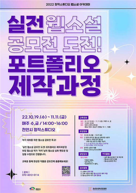 õ¾È½Ã°¡ Áö¿øÇϰí Ãæ³²Á¤º¸¹®È»ê¾÷ÁøÈï¿ø(¿øÀå ±èâ¼ö, ÀÌÇÏ ÁøÈï¿ø)ÀÌ ¿î¿µÇϴ âÀÛ½ºÆ©µð¿À¿¡¼ À¥¼Ò¼³ ÀÛ°¡ ¾ç¼ºÀ» À§ÇÑ ¡®½ÇÀü À¥¼Ò¼³ °ø¸ðÀü µµÀü! Æ÷Æ®Æú¸®¿À Á¦ÀÛ°úÁ¤¡¯ ±³À°»ýÀ» ¸ðÁýÇÑ´Ù.