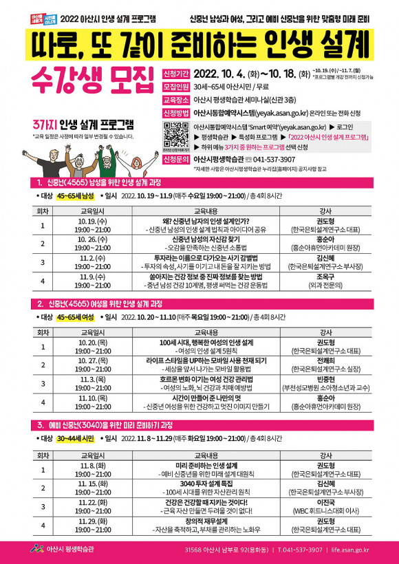 À̹ø ÇÁ·Î±×·¥Àº ¼ºº°¡¤¼¼´ëº° Àλý ¼³°è ¿ä±¸¿¡ ¸ÂÃç ¡â½ÅÁ߳⠳²¼ºÀ» À§ÇÑ Àλý ¼³°è °úÁ¤ ¡â½ÅÁ߳⠿©¼ºÀ» À§ÇÑ Àλý ¼³°è °úÁ¤ ¡â¿¹ºñ ½ÅÁß³âÀ» À§ÇÑ ¹Ì¸® ÁغñÇϱ⠰úÁ¤ ÃÑ 3°³ÀÇ ±³À°°úÁ¤À¸·Î ±¸¼ºµÆÀ¸¸ç, ¿À´Â 10¿ù 19ÀϺÎÅÍ 11¿ù 29ÀϱîÁö °úÁ¤º° 4ȸ ÁøÇàµÈ´Ù.