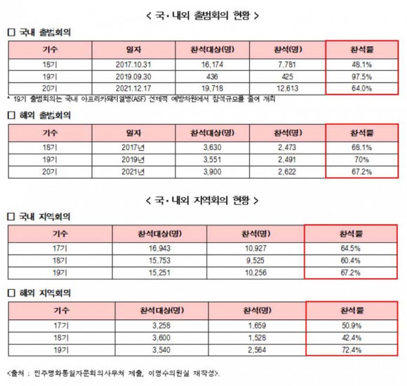 À̸í¼ö ÀÇ¿øÀÌ ¹ÎÁÖÆòÅëÀ¸·ÎºÎÅÍ Á¦Ãâ¹ÞÀº ÀÚ·á¿¡ µû¸£¸é, Á¦18±â Ãâ¹üȸÀÇ Âü¼®·üÀº ±¹³» 48%¡¤ÇØ¿Ü 68%¿´À¸¸ç, Á¦20±âÀÇ °æ¿ì¿¡´Â ±¹³» 64%¡¤ÇØ¿Ü 67% ¼öÁØÀ̾ú´Ù.