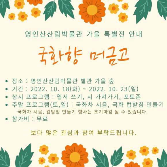 À̹ø Ưº°Àü ±â°£ µ¿¾È¿¡´Â ¿±¼ ¾²±â, ½Ã °¡Á®°¡±â, Æ÷ÅäÁ¸ µî ´Ù¾çÇÑ Ã¼Çè ÇÁ·Î±×·¥ÀÌ ¿µÀλê»ê¸²¹Ú¹°°ü º°°ü¿¡¼ »ó½Ã ¿î¿µµÇ¸ç, °³¸·ÀÏ(18ÀÏ)°ú ÁÖ¸»(22ÀÏ, 23ÀÏ)¿¡´Â ±¹ÈÂ÷ ½ÃÀ½, ±¹È ÄŹÞħ ¸¸µé±â Çà»çµµ ÆîÃÄÁø´Ù.