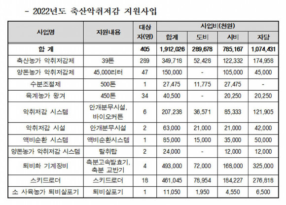 ¼¼ ¹øÂ°·Î, ¾ÇÃë °ÆÁ¤ ¾ø´Â ÄèÀûÇÑ Ãà»ê¾÷ ȯ°æÀ» Á¶¼ºÇϱâ À§ÇÏ¿© 2022³âµµ¿¡ ¾ÇÃëÁßÁ¡°ü¸®³ó°¡¸¦ ´ë»óÀ¸·Î 11°³ »ç¾÷, 19¾ï ¿øÀ» ÅõÀÔÇØ Áö¿øÇßÀ¸¸ç, 2023³âµµ¿¡´Â ½Å±Ô»ç¾÷À¸·Î ¾çµ·³ó°¡ 4°³¼Ò¿¡ ICTȰ¿ë ¾ÇÃëÀú°¨½Ã½ºÅÛ ½Ã¹ü»ç¾÷À» ÃßÁøÇØ Ãà»ç ¾ÇÃë ¹®Á¦¸¦ ÇØ°áÇϰí Ãà»ê¾÷ÀÇ À̹ÌÁö Å»¹Ù²Þ¿¡ ³ë·ÂÇÏ°Ú´Ù°í ¸»Çß´Ù.