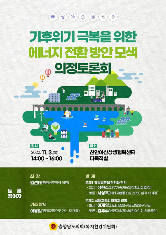 Ãæ³²µµÀÇȸ°¡ ±è¼±Å ÀÇ¿ø(õ¾È10¡¤´õºÒ¾î¹ÎÁÖ´ç)ÀÇ ½ÅûÀ¸·Î 11¿ù 3ÀÏ ¿ÀÈÄ 2½Ã, õ¾È¾Æ»ê»ó»ýÇù·Â¼¾ÅÍ¿¡¼ ¡®±âÈÄÀ§±â ±Øº¹À» À§ÇÑ ¿¡³ÊÁö Àüȯ ¹æ¾È ¸ð»ö¡¯À» ÁÖÁ¦·Î ÀÇÁ¤Åä·Ðȸ¸¦ °³ÃÖÇÑ´Ù.