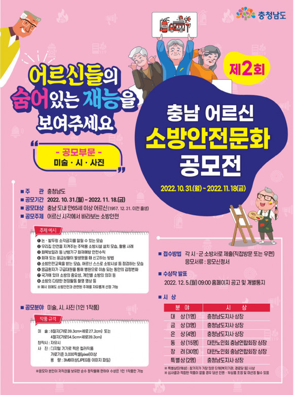 À̹ø °ø¸ðÀüÀº Ãæ³²¿¡ °ÅÁÖ ÁßÀÎ ¸¸ 65¼¼(1957³â ÀÌÀü Ãâ»ý)ÀÌ»óÀÇ ¾î¸£½ÅµéÀ» ´ë»óÀ¸·Î ÇÏ¸ç °ø¸ð ºÐ¾ß´Â ¾î¸£½ÅÀÌ ¹Ù¶óº¸´Â ¼Ò¹æ¾ÈÀü¿¡ °üÇÑ ¹Ì¼ú, âÀÛ½Ã, »çÁø 3°³ ºÐ¾ß·Î ÁøÇàµÇ¸ç 1Àδç 1ÀÛǰ °ø¸ð°¡ °¡´ÉÇÏ´Ù.