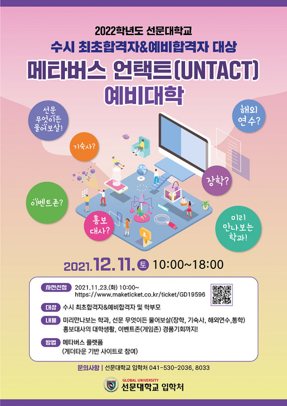 ÇÑÆí ¿¹ºñ ´ëÇÐÀº ¼±¹®´ë ÀÔÇÐó ȨÆäÀÌÁö(http://ilove.sunmoon.ac.kr)¿¡¼ ¹Ù·Î Âü¿©ÇÒ ¼ö ÀÖÀ¸¸ç, »çÀü ½ÅûÀÚ¿¡°Ô´Â Ãß÷À» ÅëÇØ ¼ÒÁ¤ÀÇ »óǰÀ» ¹ÞÀ» ¼ö ÀÖ´Ù. ¼±¹®´ë ¿¹ºñ ´ëÇлý°ú Çкθ𸦠ºñ·ÔÇØ ´©±¸³ª Âü¿©ÇÒ ¼ö ÀÖ´Ù.