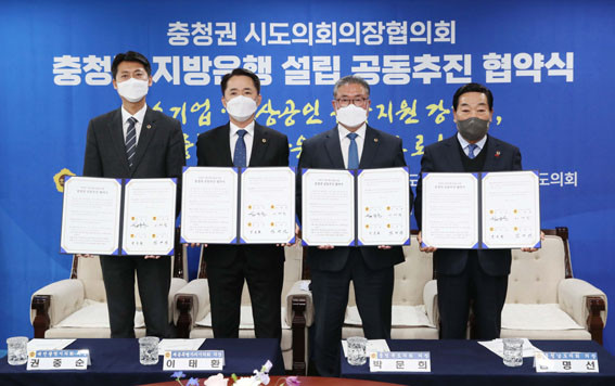 Ãæ³²µµÀÇȸ ±è¸í¼± ÀÇÀå°ú ´ëÀü½ÃÀÇȸ ±ÇÁß¼ø ÀÇÀå, ¼¼Á¾½ÃÀÇȸ ÀÌÅÂȯ ÀÇÀå, ÃæºÏµµÀÇȸ ¹Ú¹®Èñ ÀÇÀåÀº 12¿ù 21ÀÏ Ãæ³²µµÀÇȸ ±¹Á¦È¸°ßÀå¿¡¼ ÃæÃ»±Ç Áö¹æÀºÇà ¼³¸³ ÃßÁøÀ» À§ÇÑ ÃæÃ»±Ç ½Ã¡¤µµÀÇȸ °øµ¿Çù¾à½ÄÀ» °³ÃÖÇß´Ù.