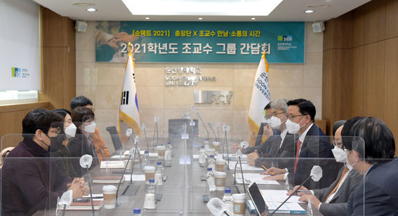 | | ¡è¡è ¡ã±è½Â¿ì ÃÑÀåÀÌ ½ÅÁø ±³¼ö ±×·ì°úÀÇ ¼ÒÅë °£´ãȸ¸¦ ÁøÇàÇϰí ÀÖ´Ù. <»çÁøÁ¦°ø=¼øÃµÇâ´ëÇб³> | ¨Ï ¿Â¾ç½Å¹® | | ¼øÃµÇâ´ëÇб³ ±è½Â¿ì ÃÑÀåÀº ´ëÇÐ º»°ü 3Ãþ ȸÀǽǿ¡¼ ´Ü°ú´ëÇк° ½ÅÁø ±³¼ö ±×·ìÀ» ´ë»óÀ¸·Î ¸ôÀÔÇü ¼ÒÅë °£´ãȸ¸¦ ÁøÇàÇÑ´Ù°í Áö³ 12¿ù 21ÀÏ ¹àÇû´Ù.