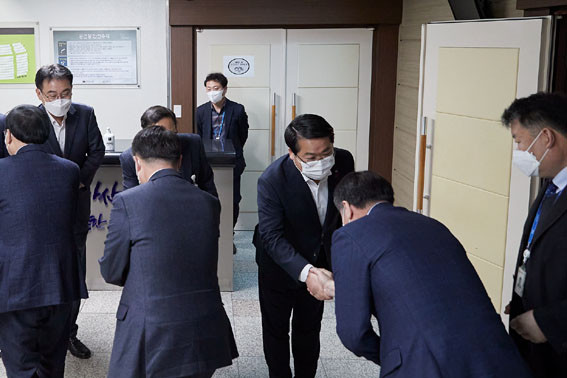 À̳¯ ½Ã¹«½Ä¿¡ ¾Õ¼ ¿ÀÀü 8½Ã 20ºÐ ½ÃÀå½Ç¿¡¼ ±¹¡¤¼ÒÀå µî °£ºÎ °ø¹«¿ø°ú ½Å³âÀÎ»ç ¹× ´ö´ãÀ» °¡Á³´Ù.