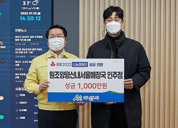 | | ¡è¡è ¡ã¿À¼¼Çö ½ÃÀå°ú ÃÖÀç¹Î »çÀå(¿À¸¥ÂÊ)ÀÌ ¼º±Ý Àü´Þ ÈÄ ±â³ä»çÁøÀ» Âï°í ÀÖ´Ù <»çÁøÁ¦°ø=¾Æ»ê½Ã> | ¨Ï ¿Â¾ç½Å¹® | | ¿øÁ¶¾çÆò½Å³»¼¿ïÇØÀå±¹ ÀÎÁÖÁ¡(°øµ¿´ëÇ¥ ÀÌ¿µÀç, ÃÖÀç¹Î)ÀÌ Áö³ 1¿ù 10ÀÏ ¾Æ»ê½Ã¸¦ ¹æ¹®ÇØ ¼Ò¿Ü°èÃþ ¾Æµ¿ Áö¿øÀ» À§ÇÑ ¡®Èñ¸Á2022³ª´®Ä·ÆäÀΡ¯ ¼º±Ý 1õ¸¸ ¿øÀ» ±âºÎÇß´Ù.
