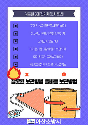 °Ü¿ï¿ëǰÀ» ¾ÈÀüÇÏ°Ô »ç¿ëÇϱâ À§Çؼ´Â ¡ã³¹æ¿ëǰ ±¸ÀÔ ½Ã ¾ÈÀüÀÎÁõ(KC¸¶Å©) Á¦Ç° ±¸ÀÔ ¡ãÀü±âÀåÆÇ ¿¼± ²ªÀÓ ¹× ´¸² ÁÖÀÇ ¡ãÀü±âÁ¦Ç° ÁÖº¯ °¡¿¬¹° Á¦°Å¡ã¹Ì»ç¿ë ¶Ç´Â ¿ÜÃ⠽à Àü¿±â±¸ Àü¿ø Â÷´Ü ¡ãÁÖº¯¿¡ ¼Òȱ⠺ñÄ¡Çϱ⠵îÀÌ ÀÖ´Ù.