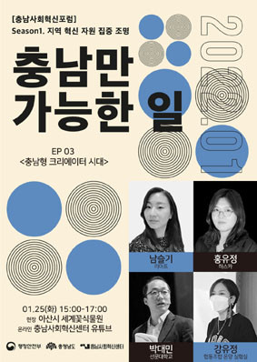 ÀÛ³â 11¿ùºÎÅÍ ÃÑ 4ȸ¿¡ °ÉÃÄ ÁøÇàµÇ°í ÀÖ´Â <Ãæ³²»çȸÇõ½ÅÆ÷·³ ½ÃÁð1: Ãæ³²¸¸ °¡´ÉÇÑ ÀÏ> ½Ã¸®ÁîÀÇ À̹ø 3ȸÂ÷ Æ÷·³ÀÇ ÁÖÁ¦´Â ¡®Ãæ³²Çü Å©¸®¿¡ÀÌÅÍ ½Ã´ë¡¯ÀÌ´Ù.