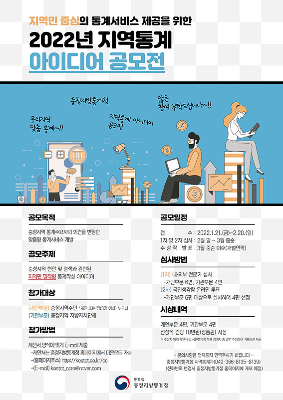 ÃæÃ»Áö¹æÅë°èû(ûÀå ¹Ú¿ø¶õ)Àº ÃæÃ»Áö¿ª Åë°è¼ö¿äÀÚµéÀÌ ¿øÇÏ´Â ¸ÂÃãÇü Åë°è¼ºñ½º Á¦°øÀ» À§ÇØ 2022³â ¡®Áö¿ªÅë°è ¾ÆÀ̵ð¾î °ø¸ðÀü¡¯À» °³ÃÖÇÑ´Ù.
