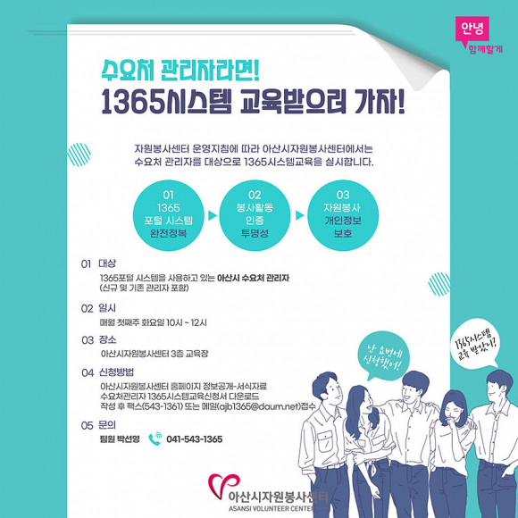 Âü¿© ¹æ¹ýÀº ¾Æ»ê½ÃÀÚ¿øºÀ»ç¼¾ÅÍ È¨ÆäÀÌÁö(http://asan.v1365.org) -Á¤º¸°ø°³-¼½ÄÀÚ·á¿¡¼ ¡®¼ö¿äó °ü¸®ÀÚ 1365½Ã½ºÅÛ±³À°½Åû¼¡¯¸¦ ´Ù¿î·ÎµåÇØ ÀÛ¼º ÈÄ ÆÑ½º(041-543-1361) ¶Ç´Â À̸ÞÀÏ(ajb1365@daum.net)·Î ½ÅûÇÏ¸é µÈ´Ù.