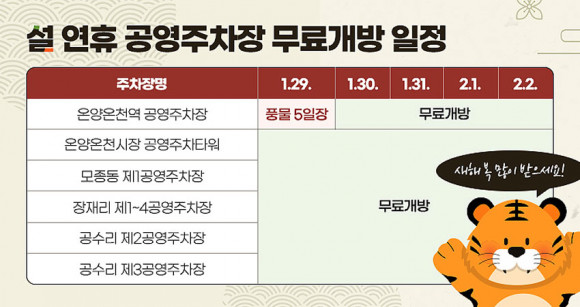 | | ¡è¡è <ÀÚ·áÁ¦°ø=¾Æ»ê½Ã½Ã¼³°ü¸®°ø´Ü> | ¨Ï ¿Â¾ç½Å¹® | | ÀÌ¿¡ µû¶ó ¡ã¿Â¾ç¿Âõ½ÃÀå °ø¿µÁÖÂ÷Ÿ¿ö ¡ã¿Â¾ç¿Âõ¿ª °ø¿µÁÖÂ÷Àå ¡ã¸ðÁ¾µ¿ Á¦1°ø¿µÁÖÂ÷Àå ¡ãÀåÀ縮 Á¦1~4°ø¿µÁÖÂ÷Àå ¡ã°ø¼ö¸® Á¦3°ø¿µÁÖÂ÷Àå µî °ü³» °ø¿µÁÖÂ÷Àå 6°÷À» ¿À´Â 1¿ù 29ÀϺÎÅÍ 2¿ù 2ÀϱîÁö 5Àϰ£ ¹«·á·Î ÀÌ¿ëÇÒ ¼ö ÀÖ´Ù.