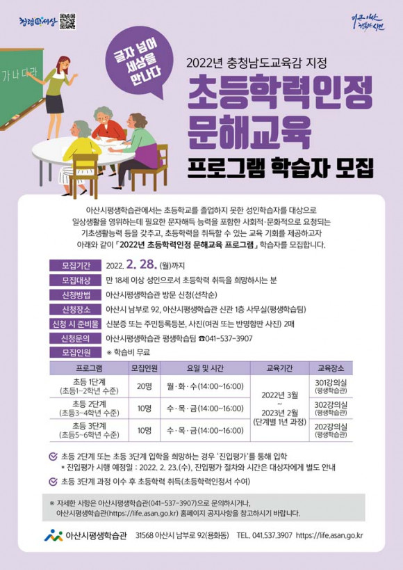 ¾Æ»ê½Ã°¡ ÃʵîÇб³¸¦ Á¹¾÷ÇÏÁö ¸øÇÑ ¼ºÀο¡°Ô ÃʵîÇзÂÀ» ÃëµæÇÒ ¼ö ÀÖ´Â ±³À° ±âȸ¸¦ Á¦°øÇϰíÀÚ ÃßÁøÇÏ´Â ¡®2022³â ÃʵîÇзÂÀÎÁ¤ ¹®Çر³À° ÇÁ·Î±×·¥¡¯ÀÇ ÇнÀÀÚ¸¦ ¸ðÁýÇÑ´Ù.