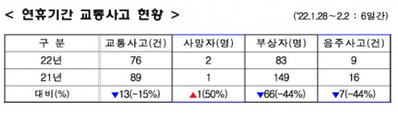 ÃæÃ»³²µµ°æÂûûÀº ¼³ ¿¬ÈÞ ±â°£ µ¿¾È(1.28¢¦2.2, 6Àϰ£) Ưº°±³Åë°ü¸® ±â°£À¸·Î ¼³Á¤, Ãѷ´ëÀÀÇÑ °á°ú Áö³ÇØ ¼³ ¿¬ÈÞ ¶§ º¸´Ù ±³Åë»ç°í ¹× À½ÁÖ±³Åë»ç°í µîÀÌ °¨¼ÒÇß´Ù°í ¹àÇû´Ù.