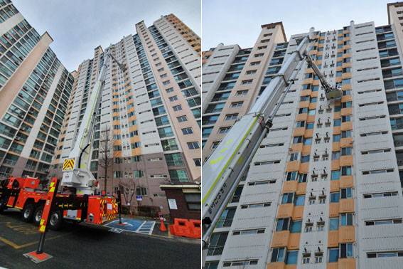 ±¸Á¶´ë¿øµéÀº ÃÖ´ë 70m ³ôÀ̱îÁö Àü°³ °¡´ÉÇÑ ±¼ÀýÂ÷ÀÇ ¹Ù½ºÄÏÀ» Ÿ°í ¿Ã¶ó°¡ 14ÃþºÎÅÍ 7Ãþ±îÁö ¼øÂ÷ÀûÀ¸·Î °íµå¸§ Á¦°Å ¹× ¾ÈÀüÁ¶Ä¡¸¦ ¸¶ÃÆ´Ù.