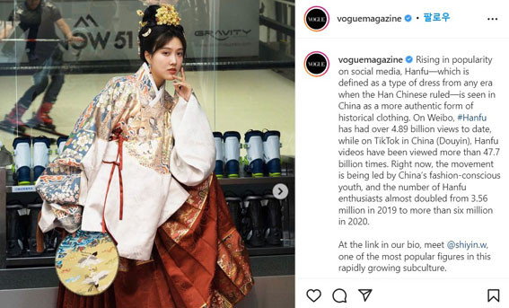 Áö³ 2ÀÏ º¸±×¸Å°ÅÁø °ø½Ä ÀνºÅ¸±×·¥¿¡ ÇѺ¹ ÀÇ»óÀ» ÀÔÀº Áß±¹ÀÎ ¸ðµ¨ »çÁøÀ» °ÔÀçÇÑ µÚ, ±× ÀÇ»óÀ» ÇÑǪ·Î ¼Ò°³ÇÏ¸é¼ ¡°ÇÑǪ´Â ÇÑÁ·ÀÌ ÅëÄ¡ÇÏ´ø ½Ã´ëÀÇ ¿ª»çÀû ÀǺ¹ Áß Çϳª¡±¶ó°í ¼³¸íÇß´Ù.