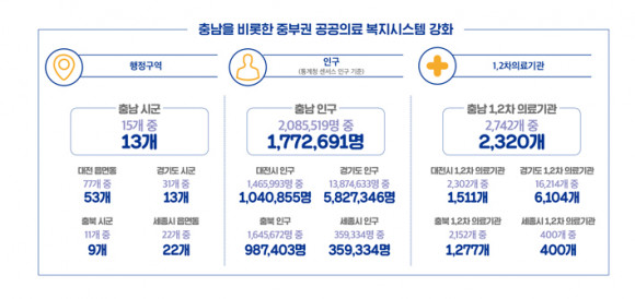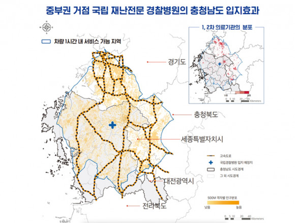 ÀÚ·á¿¡ µû¸£¸é, °æÂûº´¿ø ÀÔÁö ¿¹Á¤Áö·Î ³»¼¼¿î Ãæ³² ¾Æ»êÁö¿ª¿¡¼ ¡®Â÷·®À¸·Î 1½Ã°£ ³» ¼ºñ½º °¡´É Áö¿ª¡¯Àº Ãæ³² 13°³ ½Ã±º, ´ëÀü 53°³ À¾¸éµ¿, ÃæºÏ 9°³ ½Ã±º, ¼¼Á¾½Ã Àüü, °æ±âµµ 13°³ ½Ã±º µîÀ¸·Î ³ªÅ¸³µ´Ù. Àα¸·Î´Â ¾à 1,000¸¸ ¸í¿¡ À̸¥´Ù.