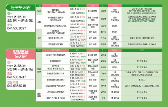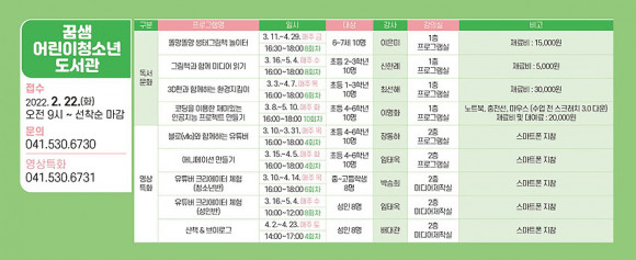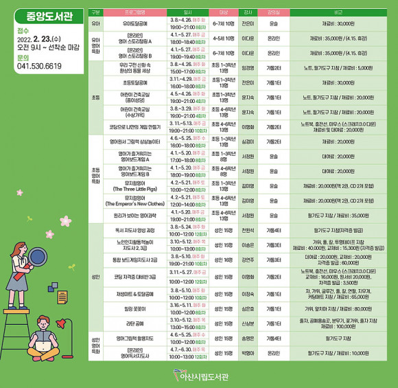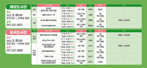 »ó¹Ý±â ÇÁ·Î±×·¥Àº µµ¼°üº°·Î À¯¾Æ¡¤Ãʵ¼ºÀÎ µî ´Ù¾çÇÑ ¿¬·É´ë¿¡ ¸Â°Ô ´ë¸é ¼ö¾÷ 48°³, ¿Â¶óÀÎÀ» Ȱ¿ëÇÑ ºñ´ë¸é ¼ö¾÷ 8°³·Î ¿î¿µµÇ¸ç, µ¶¼ ±â¹Ý ÇÁ·Î±×·¥»Ó¸¸ ¾Æ´Ï¶ó Àü¹®ÀÚ°ÝÃëµæ°úÁ¤, µµ¼°üº° ƯÈÇÁ·Î±×·¥(Áß¾Ó: ¿µ¾î, ¼Û°î: µ¶¼½É¸®, ÅÁÁ¤¿Â»ù: À¥Å÷, ²Þ»ù: ¿µ»ó) µî ´Ù¾çÇÑ ºÐ¾ß·Î ±¸¼ºµÅÀÖ´Ù.