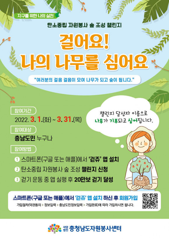縰Áö ±â°£ ³» 20¸¸ º¸ ÀÌ»óÀÇ °ÉÀ½¼ö¸¦ ´Þ¼ºÇϸé Âü¿©ÀÚ À̸§Àº ³ª¹«±âºÎÀÚ ¸í´ÜÀ¸·Î µîÀçµÇ°í, ÀÌ·¸°Ô ¸ð¾ÆÁø ³ª¹«´Â ź¼ÒÁ߸³ ÀÚ¿øºÀ»ç ½£¿¡ ½É¾îÁú ¿¹Á¤ÀÌ´Ù. ÀÌÈÄ ³ª¹«½É±â ÀÚ¿øºÀ»ç Ȱµ¿¿¡µµ °³ÀÎ ¶Ç´Â °¡Á·ÀÌ Á÷Á¢ Âü¿©ÇÒ ¼öµµ ÀÖ´Ù.