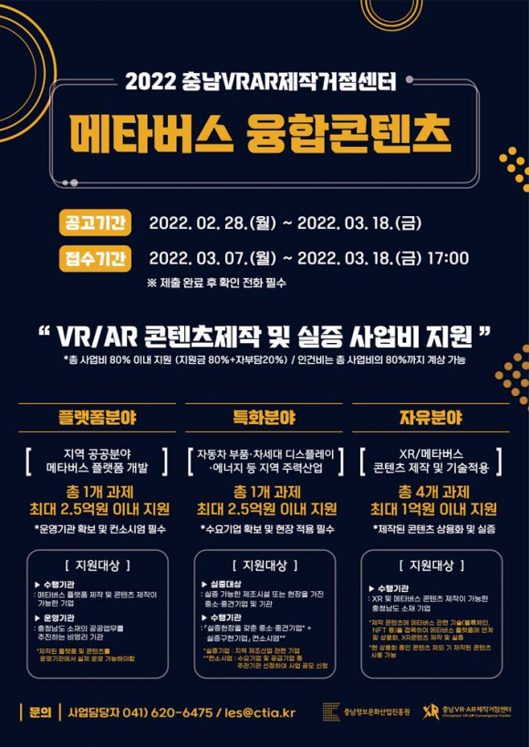 Ãæ³²Á¤º¸¹®È»ê¾÷ÁøÈï¿øÀÇ Ãæ³²VR/ARÁ¦ÀÛ°ÅÁ¡¼¾ÅÍ´Â Áö¿ª °ø°øºÐ¾ß ¸ÞŸ¹ö½º Ç÷§Æû °³¹ßÀ» Áö¿øÇϰí, Áö¿ª Æ¯È Áַ»ê¾÷ÀÇ µðÁöÅÐ ÀüȯÀ» ÀÌ·ç°íÀÚ ¡®2022³â ¸ÞŸ¹ö½º À¶ÇÕÄÜÅÙÃ÷ Áö¿ø»ç¾÷(ÃÑ Áö¿ø±Ý 9¾ï ¿ø)¡¯À» °ø¸ðÇÑ´Ù°í 3¿ù 2ÀÏ ¹àÇû´Ù.