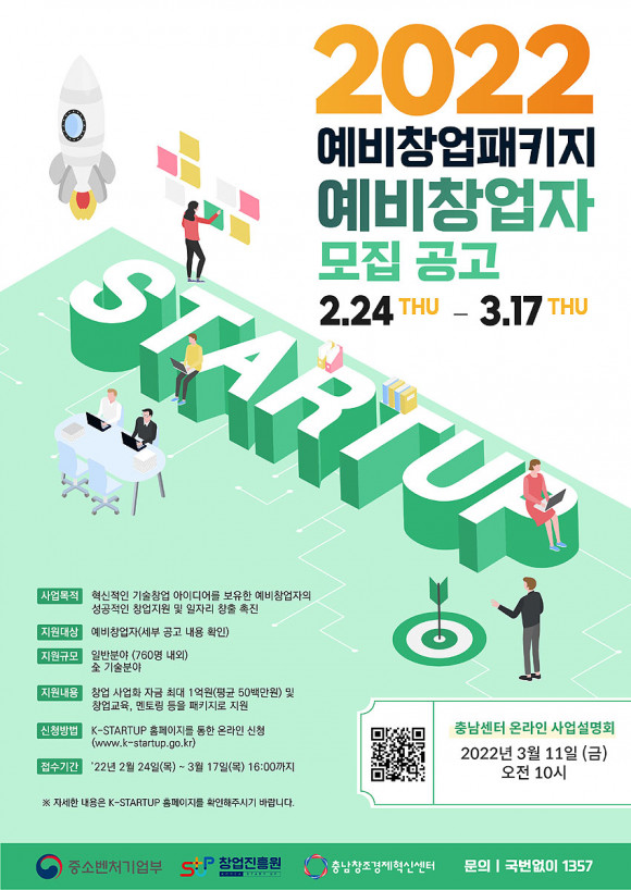 Ãæ³²Ã¢Á¶°æÁ¦Çõ½Å¼¾ÅÍ(ÀÌÇÏ Ãæ³²¼¾ÅÍ)´Â Çõ½ÅÀûÀÎ ±â¼ú â¾÷ ¾ÆÀ̵ð¾î°¡ ÀÖ´Â ¿¹ºñâ¾÷ÀÚ¿¡°Ô »ç¾÷È ÀÚ±ÝÀ» ÃÖ´ë 1¾ï ¿ø±îÁö Áö¿øÇÏ´Â ¡®2022³â ¿¹ºñâ¾÷ÆÐŰÁö¡¯ Áö¿ø»ç¾÷ ½ÅûÀÚ¸¦ ¿À´Â 3¿ù 17ÀϱîÁö ¸ðÁýÇÑ´Ù°í ¹àÇû´Ù.