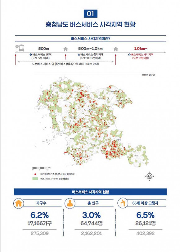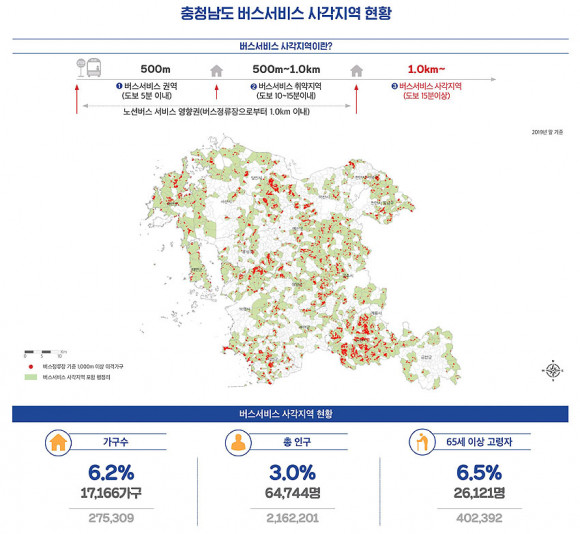 ÇöÀç Ãæ³²¿¡¼ ¹ö½º¼ºñ½º »ç°¢Áö¿ª ÇöȲÀ» º¸¸é, °¡±¸¼ö·Î´Â 1¸¸ 7õ166°¡±¸(6.2%)°¡ ÇØ´çµÇ¸ç, Àα¸¼ö·Î´Â 6¸¸ 4õ744¸í(3.0%)ÀÌ´Ù. 65¼¼ ÀÌ»ó °í·ÉÀÚ´Â 2¸¸ 6õ121¸í(6.5%)À¸·Î ³ªÅ¸³µ´Ù.