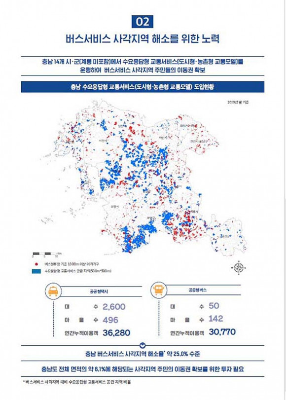 ¿¬±¸ÁøÀº ¡°ÇöÀç Ãæ³²µµ°¡ Á¦°øÁßÀÎ ¼ö¿äÀÀ´äÇü ¼ºñ½º´Â ´ëÁß±³Åë »ç°¢Áö¿ª ÁÖ¹ÎÀÇ À̵¿±Ç È®º¸¿¡ Å« ¿ªÇÒÀ» Çϸç, ÀÌ¿ë ¸¸Á·µµ°¡ ¸Å¿ì ³ô¾Æ ±¹³» »Ó¸¸ ¾Æ´Ï¶ó ÇØ¿Ü¿¡¼µµ Å« È£ÆòÀ» ¾ò°í ÀÖ´Ù¡±¸ç ¡°Æ¯È÷ °ø°øÇüÅýô µµ³» 496°³ ¸¶À»¿¡ 2õ600´ë¸¦ ÅõÀÔÇØ ¿¬°£ 36,280¸í(´©Àû)ÀÌ, °ø°øÇü¹ö½º´Â 142°³ ¸¶À»¿¡ 50´ë¸¦ ¿î¿µÇÏ¸ç ¿¬°£ 3õ770¸í(´©Àû)ÀÌ ÀÌ¿ëÇÏ´Â µî 25% Á¤µµÀÇ ¹ö½º¼ºñ½º »ç°¢Áö¿ª ÇØ¼ÒÀ²À» ´Þ¼ºÇß´Ù¡±°í ¼³¸íÇß´Ù.