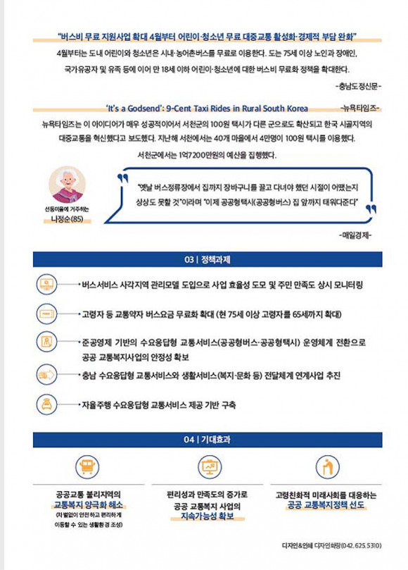 ÀÌ¿¡ ¡°¹ö½º¼ºñ½º »ç°¢Áö¿ª ÇØ¼Ò¸¦ À§ÇØ ¡â¹ö½º¼ºñ½º »ç°¢Áö¿ª °ü¸®¸ðµ¨ µµÀÔ ¹× ÁֹΠ¸¸Á·µµ »ó½Ã ¸ð´ÏÅ͸µ ¡â¹ö½º¿ä±Ý ¹«·áȸ¦ 75¼¼ ÀÌ»ó °í·ÉÀÚ¿¡¼ 65¼¼±îÁö È®´ë ¡âÁذø¿µÁ¦ ±â¹ÝÀÇ ¼ö¿äÀÀ´äÇü ±³Å뼺ñ½º ¿î¿µÃ¼°è Àüȯ ¡â¼ö¿äÀÀ´äÇü ±³Å뼺ñ½º¿Í »ýȰ¼ºñ½º(º¹Áö, ¹®È µî) ¿¬°è»ç¾÷ µîÀ» ÃßÁøÇØ¾ß ÇÑ´Ù¡±¸ç ¡°ÇâÈÄ Ãæ³²µµ°¡ °ø°ø ±³Å뺹ÁöÁ¤Ã¥À» ¼±µµÇÔÀ¸·Î½á ±³Åë ¾ç±ØÈ¸¦ ÇØ¼ÒÇÏ°í °í·ÉÄ£ÈÀû ¹Ì·¡»çȸ¸¦ ´ëºñÇÏ´Â Áö¼Ó °¡´ÉÇÑ ±³Å뺹ÁöÁ¤Ã¥À» À̲ø°Ô µÉ °Í¡±À̶ó°í ¸»Çß´Ù
